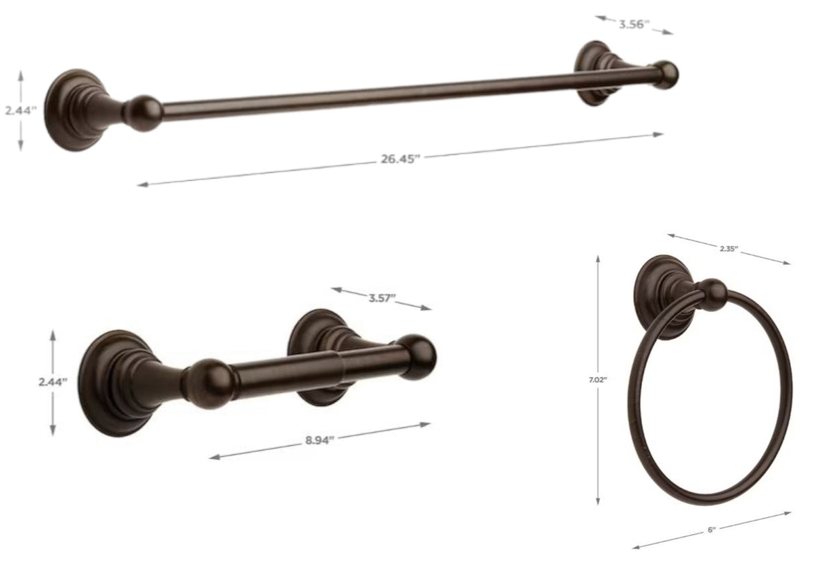- Includes 18" Towel bar with 6" extender bar for 24" setup, towel ring, and spring loaded toilet paper holder.